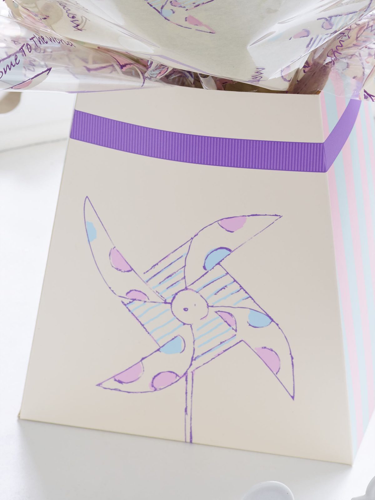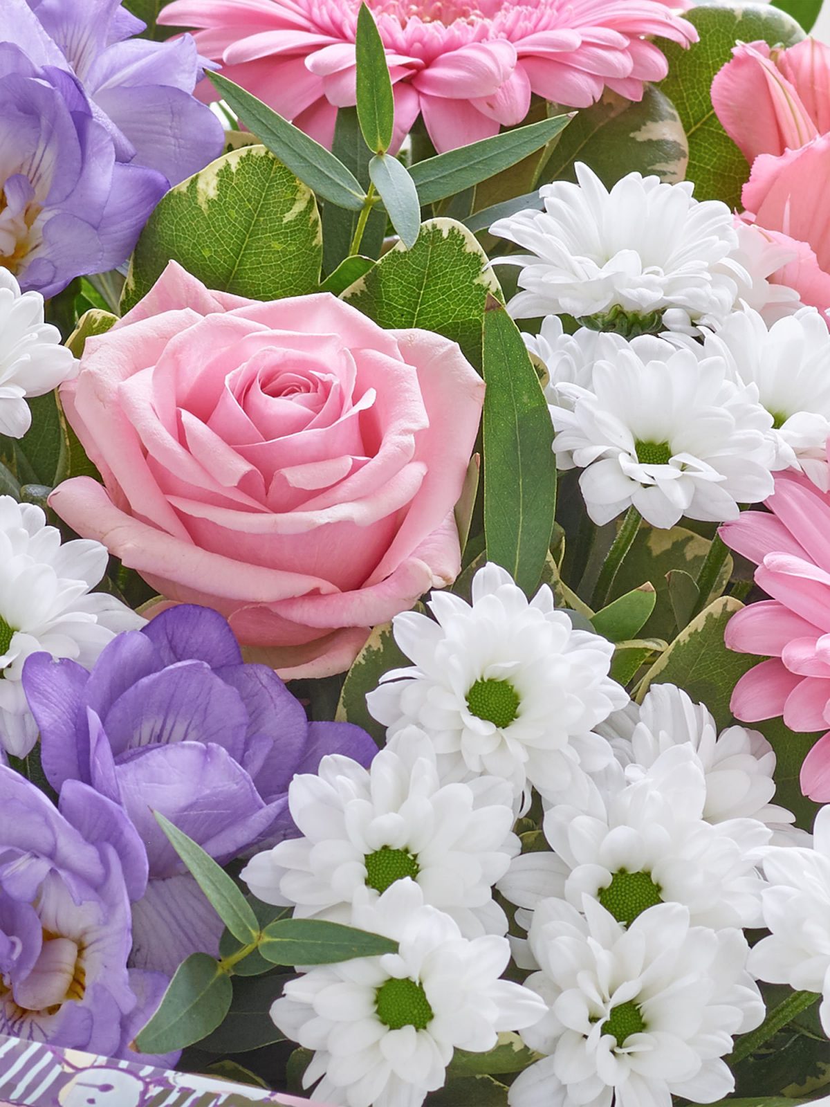 A pretty gift box consisting of lilac freesia, pink germini, pink large headed rose, white spray chrysanthemums and pink alstroemeria with softly scented eucalyptus and pittosporum. In a candy stripped windmill giftbox perfect for the occasion.
