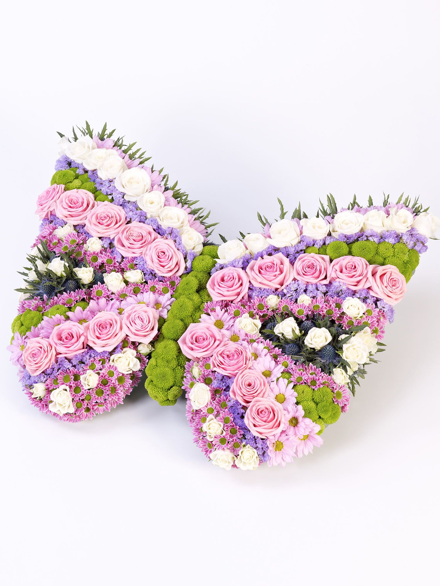 An array of pinks, lilacs, lime green and white make up this beautiful butterfly-shaped floral tribute. The display features spray chrysanthemums, pink and white roses, blue eryngium, lilac statice and lime green spray chrysanthemums. Please provide the name of the deceased, name of the funeral home, cemetery or crematorium, the service time and a contact telephone number for a family member or funeral home in the Delivery Instructions field within the Checkout.