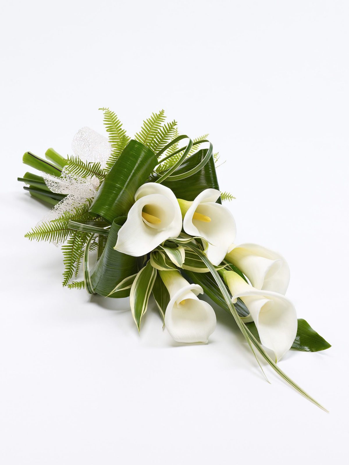 Classic white calla lilies tied with a natural ribbon are complemented by folded aspidistra leaves and dracaena to create this contemporary sheaf. Please provide the name of the deceased, name of the funeral home, cemetery or crematorium, the service time and a contact telephone number for a family member or funeral home in the Delivery Instructions field within the Checkout.