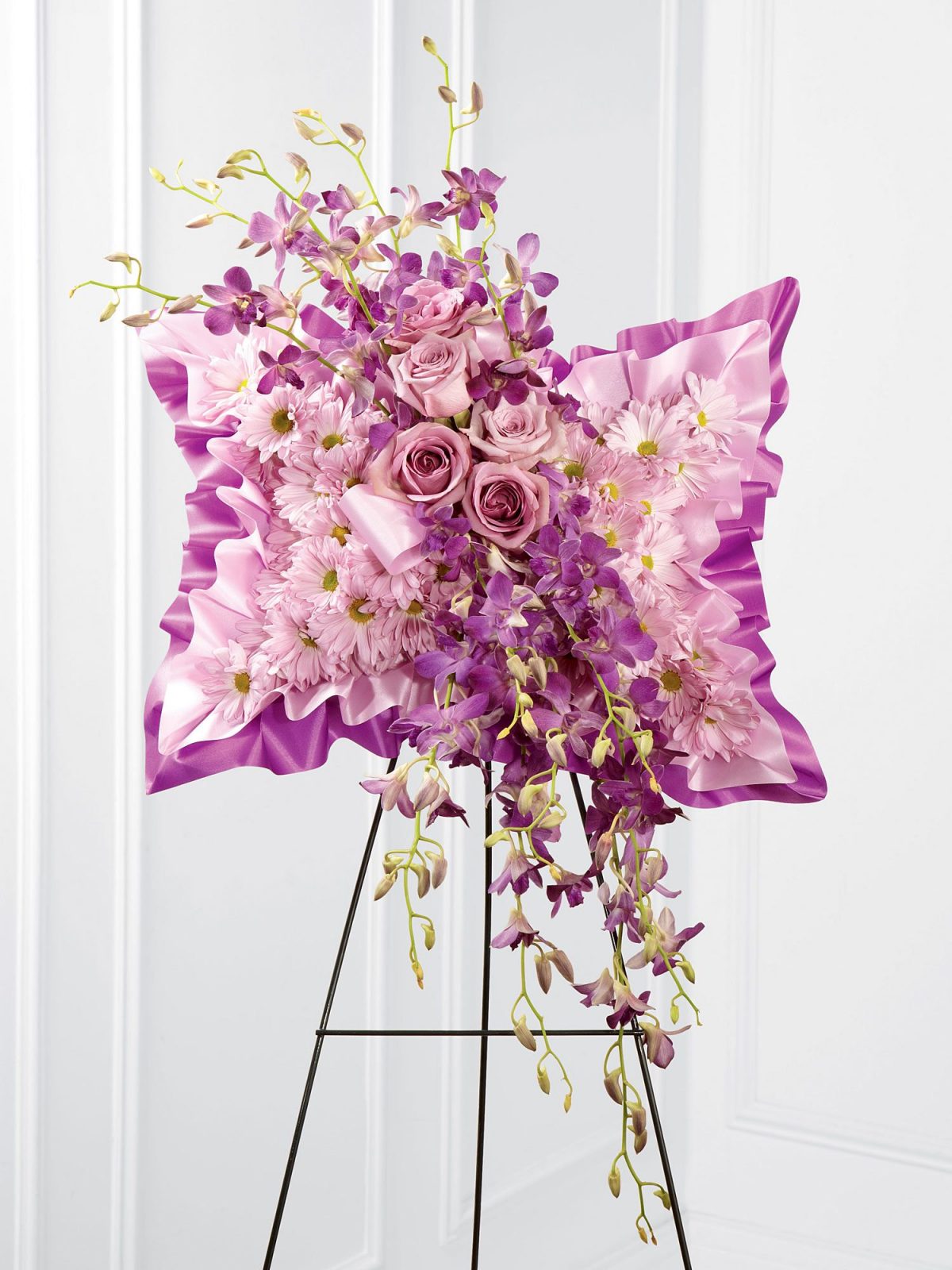 Light pink spray chrysanthemums, purple dendrobium orchids and lavender roses are beautifully arranged against a bed of purple and lavender satin to create a stunning presentation. This arrangement bursts with grace and elegance.