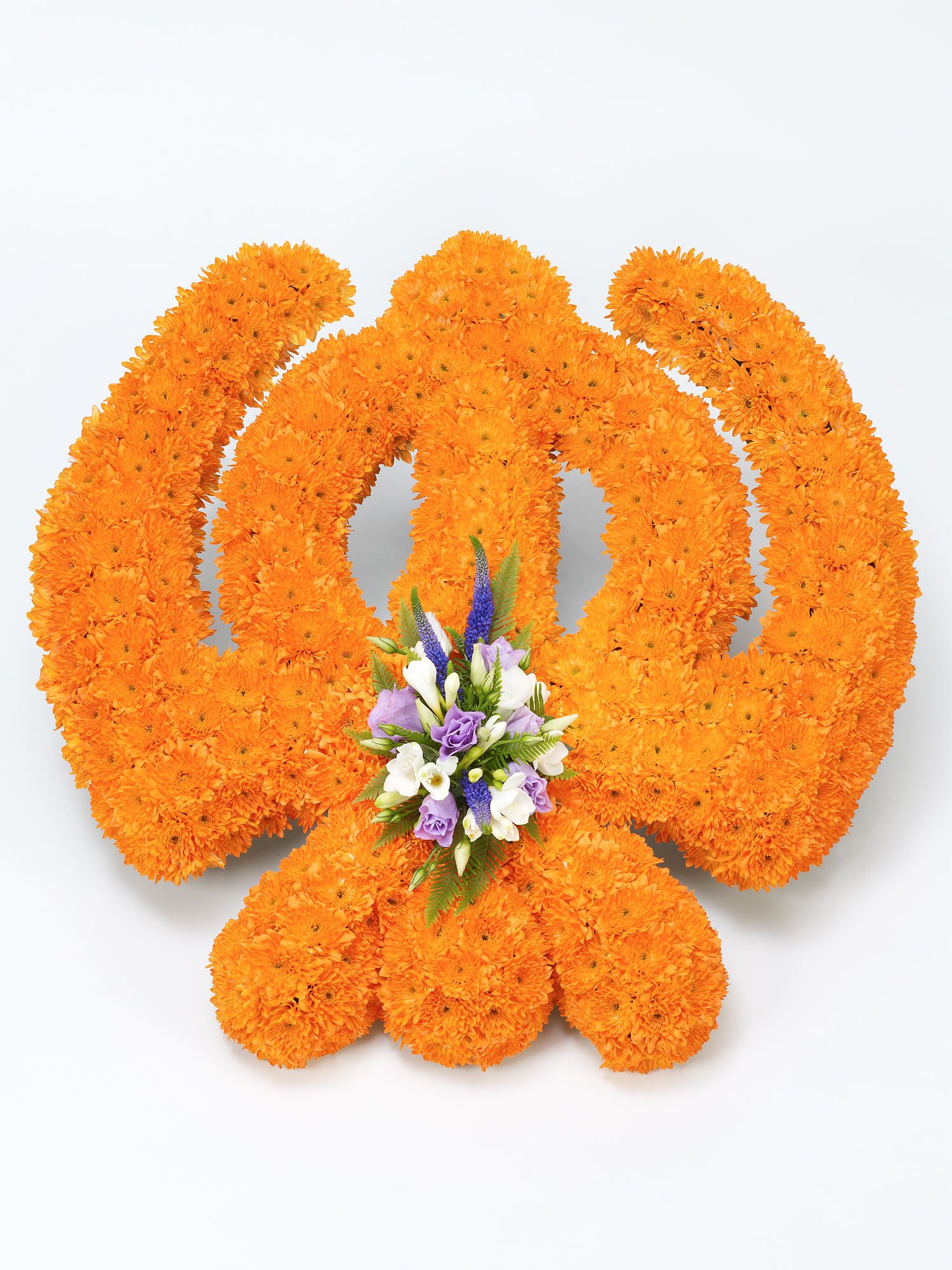 A mass of orange double spray chrysanthemums forms the Khanda tribute which is finished with a spray of white freesias, lilac lisianthus and blue veronica. Please provide the name of the deceased, name of the funeral home, cemetery or crematorium, the service time and a contact telephone number for a family member or funeral home in the Delivery Instructions field within the Checkout.