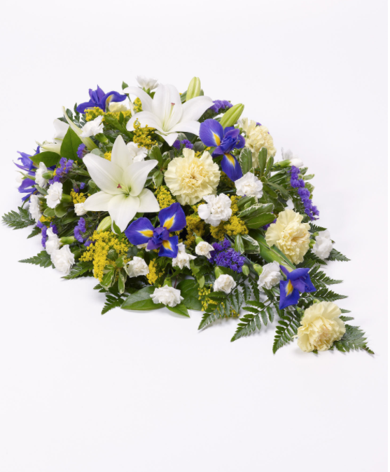 Asiatic lilies and carnations are presented with irises, spray carnations and choice foliage to create this lemon and blue teardrop spray.
