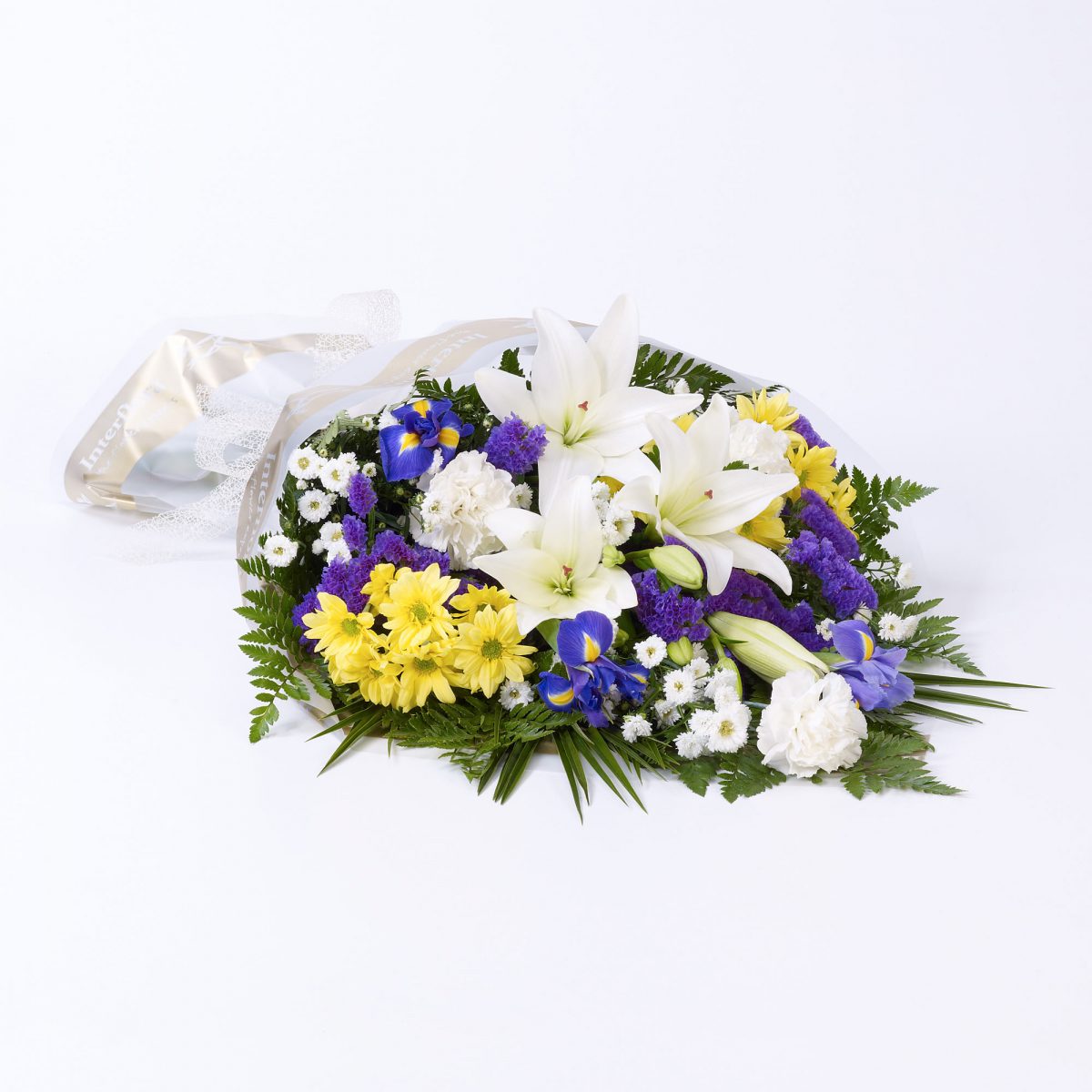 This sheaf of fresh flowers is simply arranged and presented wrapped and tied with a ribbon. The selection includes cream Asiatic lilies, blue iris, white carnations, yellow spray chrysanthemums, white September flowers and blue statice, hand-tied with leather leaf and palm leaves.